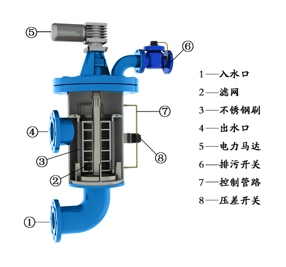 全自動自清洗過濾器由驅(qū)動機構(gòu)、控制管路(包括壓差開關(guān))、主管組件、濾芯組件、清洗機構(gòu)、連接法蘭等主要零部件組成。